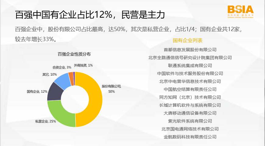 百强企业中,股份有限公司占比最高,达50%,其次是私营企业,占比1/4,民营企业正在成为北京市软件行业创新重要组成部分。同时,国有企业实力也不容小觑,共12家,较上年增长33%。