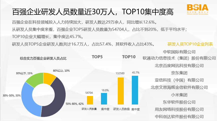 第四,百强企业研发人员数量近30万人,TOP10集中度高。
