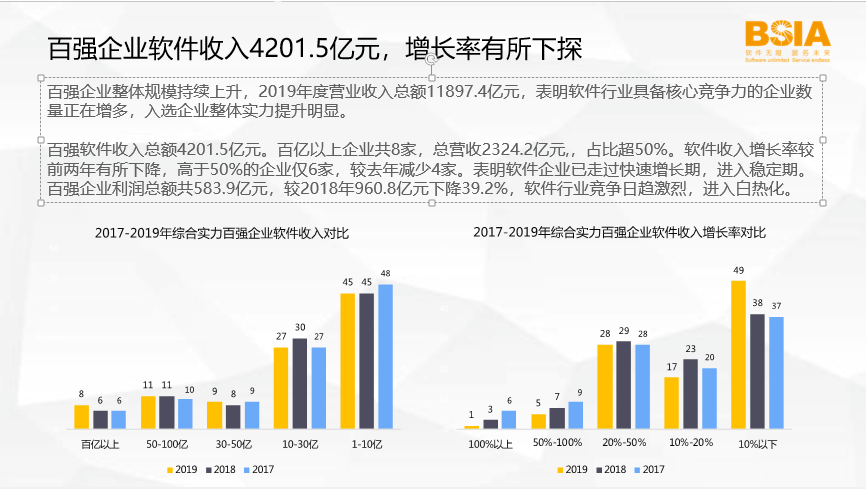 总体来看,百强企业整体规模持续上升,入选企业营收总额较上年有大幅度增长。2019年度营业收入总额为11897.4亿元,较上年增长38.4%,其中软件收入总额4201.5亿元。百亿元以上企业共9家,总营收9853.8亿元。这表明软件行业具备核心竞争力的企业数量正在增多,入选企业整体实力提升明显。百强软件收入总额为4201.5亿元。百亿元以上企业共8家,总营收2324.2亿元,占比超50%。软件收入增长率较前两年有所下降,高于50%的企业仅6家,较上年减少4家。软件企业已走过快速增长期,进入稳定期。百强企业利润总额共583.9亿元,较2018年960.8亿元下降39.2%,软件行业竞争日趋激烈,进入白热化。