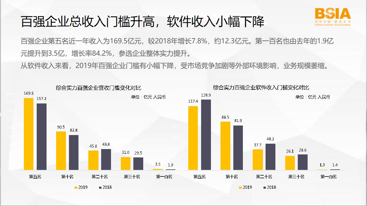 百强企业第五名近一年收入为169.5亿元,较2018年增长7.8%,约12.3亿元。第一百名由去年的1.9亿元提升到3.5亿,增长率为84.2%,参选企业整体实力提升。从百强企业的软件收入来看,2019年百强企业收入规划有小幅下降,第一百名的软件收入由2018年1.4亿元下降为1.3亿元。