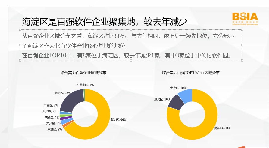 第七,从百强企业区域分布来看,海淀区占比为66%依旧处于领先地位,充分显示了海淀区作为北京软件产业核心基地的地位,也为北京市软件行业的持续高效发展,提供了有力支撑。在百强企业TOP10中,有8家位于海淀区,较上年减少1家,其中3家位于中关村软件园。