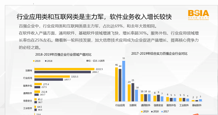 百强企业中,行业应用类和互联网类是主力军,占比达69%,和去年大致相同。在软件收入产值方面,通用软件、基础软件领域增速飞快,增长率超30%。服务外包、行业应用领域增长率也在25%左右。随着新一轮科技发展,加大信息技术应用成为企业促进产值增长、提高核心竞争力的必经之路。
