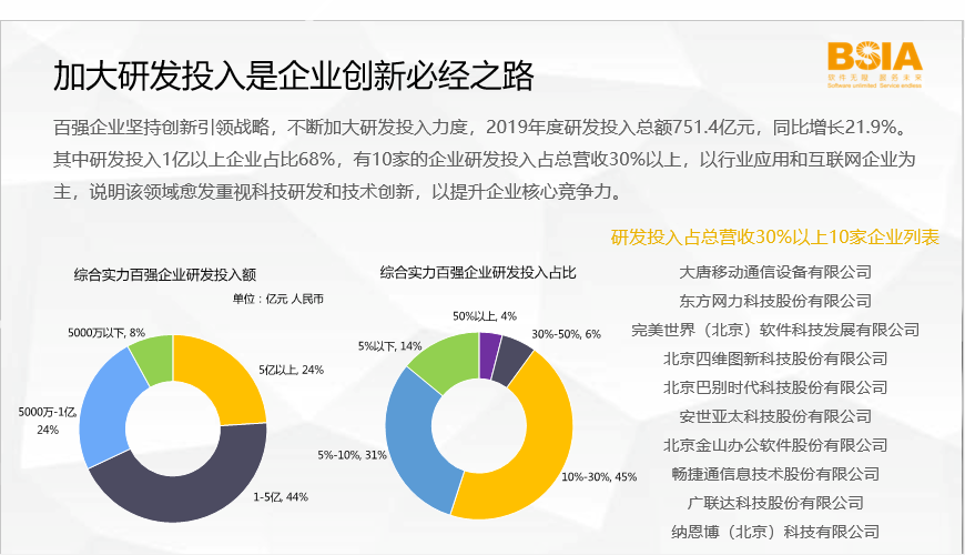 百强企业坚持创新引领战略,不断加大研发投入力度,2019年度研发投入总额751.4亿元,同比增长21.9%。其中研发投入1亿元以上企业占比68%,有10家企业的研发投入占总营收30%以上。这类企业以行业应用和互联网企业为主,说明该领域愈发重视科技研发和技术创新,以提升企业核心竞争力。