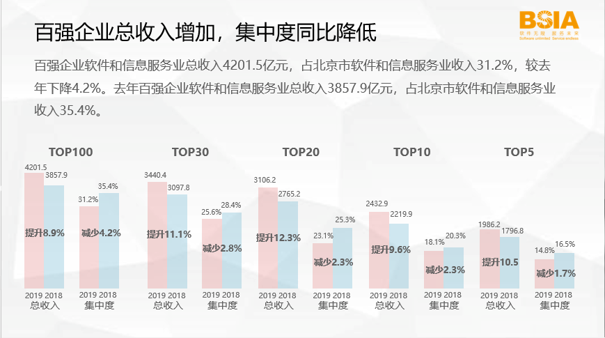 百强企业软件和信息服务业总收入4201.5亿元,占北京市软件和信息服务业收入为31.2%较上年。去年百强企业软件和信息服务业总收入为3857.9亿元,占北京市软件和信息服务业收入35.4%。