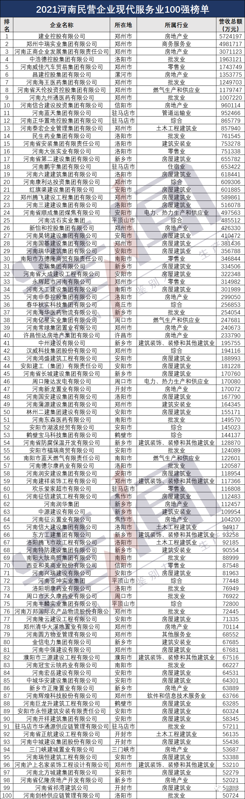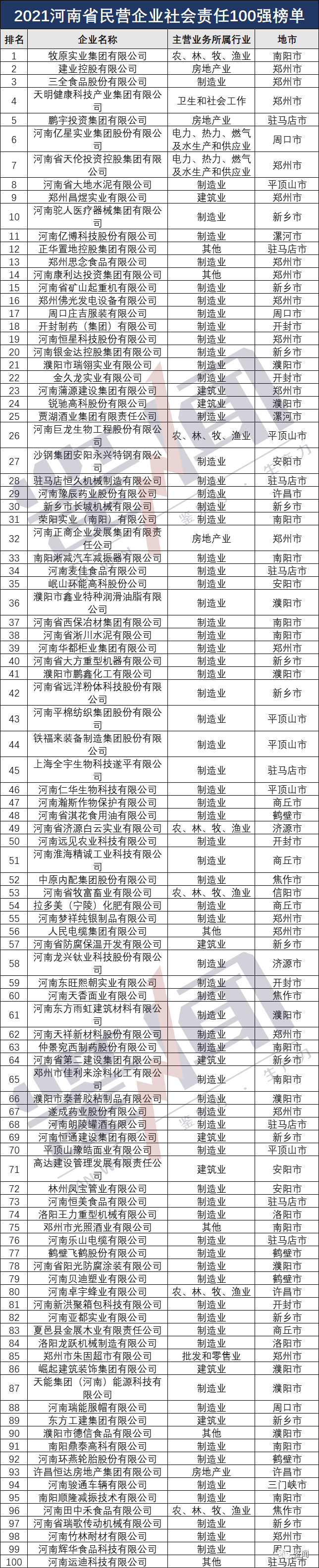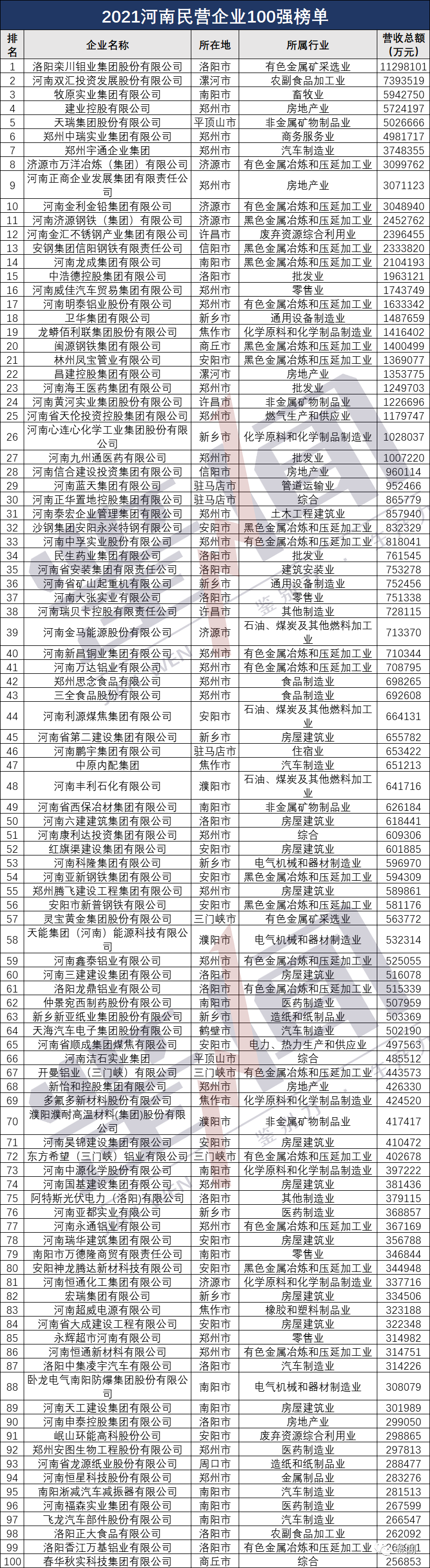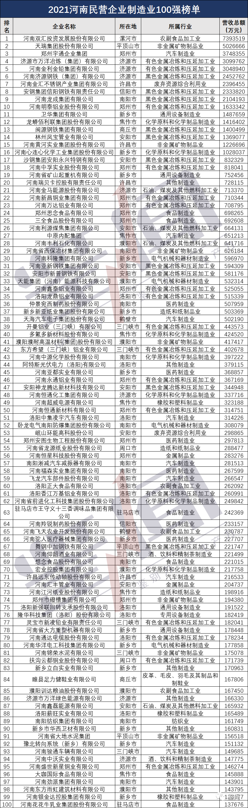 12月8日,2021河南民营企业100强新闻发布会在郑州召开,会上2021河南民营企业100强榜单正式出炉,洛阳栾川钼业集团股份有限公司、河南双汇投资发展股份有限公司、牧原实业集团有限公司位居前三名。会上,2021河南民营企业制造业100强榜单、2021河南民营企业现代服务业100强榜单、2021河南民营企业社会责任100强榜单等一并发布。